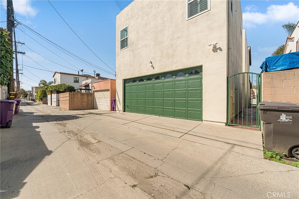 A view of a garage entrance located on a narrow alleyway. The garage features a distinctive green door with multiple windows, adding character to its utilitarian design. The building’s exterior is finished with a light-colored stucco, providing a modern contrast to the traditional homes visible in the background. On either side of the driveway, recycling and trash bins add functional elements to the scene. The alleyway is flanked by utility poles and overhead power lines, while the open space creates a sense of accessibility. The setting is casual, reflecting the blend of residential and urban environments.