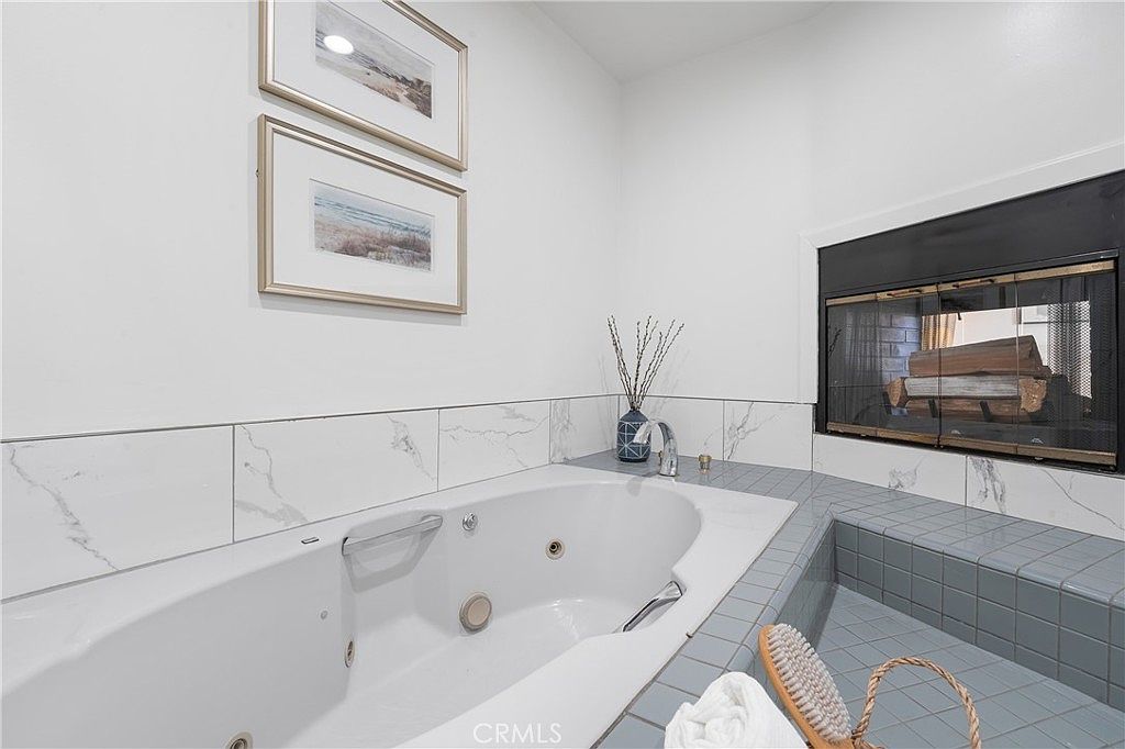 This tranquil bathroom features a luxurious spa-like ambiance. A large, white jetted tub sits against a backdrop of smooth, white walls and a striking gray tile backsplash. Above the tub, two framed coastal-themed artworks add a serene touch. Natural light filters through, casting a warm glow. To the side, a built-in fireplace offers a cozy accent, its black screen embracing the stacked logs within. Decorative elements like a simple vase with dried twigs and a natural bristle brush complement the calming atmosphere. Overall, the combination of textures and a soothing color palette creates an inviting retreat.