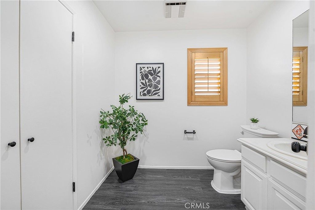 A compact bathroom featuring a minimalist design with pristine white walls enhancing the sense of space. Natural light filters through a wooden shuttered window, illuminating the room. A modern, sleek vanity with a white countertop offers functionality, complemented by polished chrome fixtures. Accented by a decorative framed artwork, the decor introduces contrast with black and white floral patterns. A potted green plant adds a touch of nature, enhancing the fresh and clean atmosphere. The dark laminate flooring contrasts elegantly with the lighter elements, creating a contemporary yet inviting feeling in this well-organized space.
