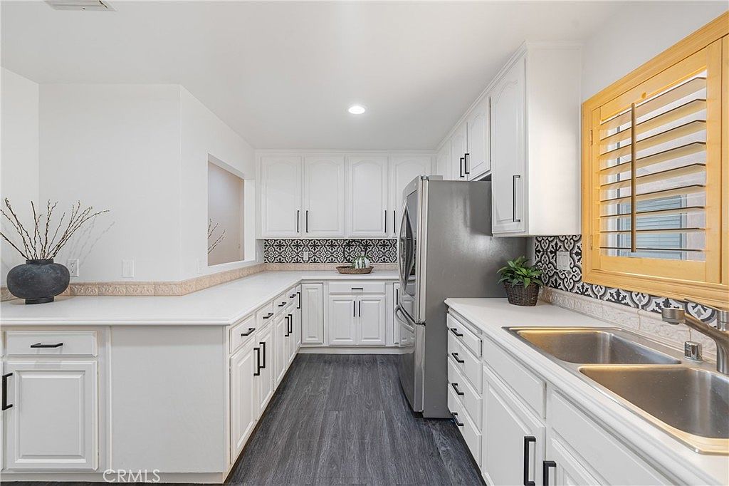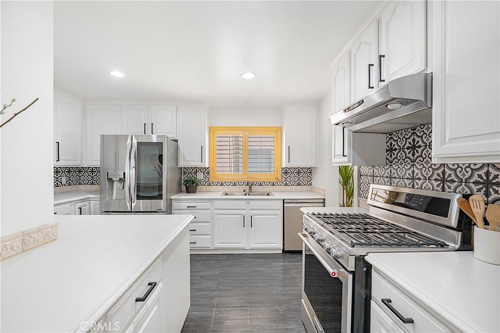 This kitchen features a modern aesthetic with clean lines and a functional layout. The cabinetry is all white, providing a fresh and bright ambiance. A sleek stainless steel refrigerator stands prominently, complemented by a stainless steel oven and range. The backsplash showcases intricate black and white tile patterns, creating a stylish contrast against the glossy surface of the countertop. Natural light streams in through a window adorned with warm wooden shutters. Gray tile flooring adds a neutral touch, harmonizing with the metallic elements and creating a cohesive visual experience that combines functionality with elegance.