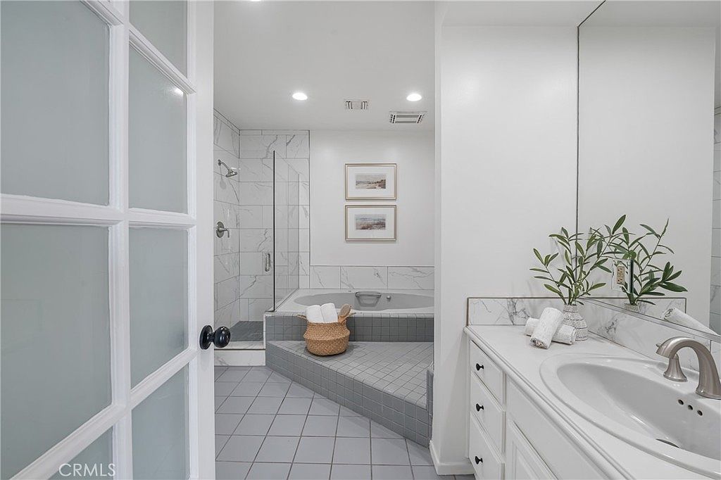 This bathroom features a modern design with a clean, minimalist aesthetic. The color scheme is primarily white, complemented by soft gray tile and marble accents, creating a bright, airy feel. A spacious vanity with a sleek sink offers ample storage, while elegant brushed nickel fixtures enhance the contemporary look. The shower area is enclosed, showcasing beautifully tiled walls. A corner bathtub is positioned next to the shower, surrounded by a unique raised platform and decorative artwork above, adding character. Neatly arranged towels and a plant introduce warmth, enhancing the overall inviting atmosphere of the space.