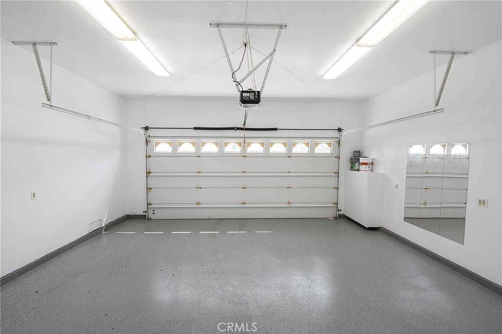 This spacious garage features a clean and minimalist aesthetic, characterized by stark white walls and a smooth gray concrete floor. The prominent garage door, equipped with large windows for natural light, is positioned at the far end. Overhead, bright fluorescent lighting ensures a well-lit environment. To the right, a small utility cabinet offers storage solutions, complementing the room’s functionality. A mirror on the wall enhances the sense of space while reflecting light. The open layout allows for easy maneuverability, making it an ideal space not just for vehicles, but for projects and storage needs.
