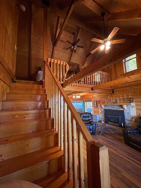 A cozy foyer features rich wooden elements, with a staircase leading to the upper level. The steps are crafted from polished hardwood, radiating warmth against the rustic wooden railings. Above, a fan with wooden blades complements the cabin ambiance, while expansive wooden beams create an inviting, open space. Light filters through large windows, illuminating the room’s earthy tones. In the background, a spacious living area showcases a stone fireplace, flanked by leather seating that enhances comfort. The entire aesthetic embodies a harmonious blend of nature and home, while decorative elements add a personal touch to this historic dwelling.