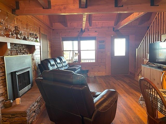 The living room features a cozy arrangement with plush, dark leather sofas positioned for comfort and conversation. A rugged wooden floor enhances the rustic charm, complemented by warm, wooden walls that create an inviting atmosphere. Above, the vaulted ceiling showcases exposed beams, adding architectural interest and a sense of openness. A stylish stone fireplace serves as a focal point, with decorative items displayed on the mantle, reflecting personal touches. Large windows allow natural light to flow in, providing views of the outdoor surroundings, while subtle decor elements enhance the overall warmth and charm of the space.