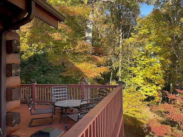This deck features a round glass table surrounded by four black metal chairs, situated amidst a backdrop of vibrant autumn foliage. The wooden deck, with its warm red tones, extends outwards, offering an unobstructed view of rolling hills and valleys below. Tall trees frame the space, their leaves in shades of gold and green, enhancing the natural aesthetic. The sky stretches overhead, a brilliant blue, creating a serene atmosphere for relaxation. The deck’s rustic railings complement the home’s log cabin architecture, seamlessly blending indoor comfort with outdoor beauty, inviting moments of tranquility and enjoyment.