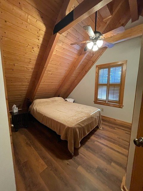 This cozy bedroom features a sloped ceiling with warm wooden beams, enhancing its rustic charm. The walls are painted a soft neutral hue, complementing the natural wood elements. A queen-sized bed dressed in a light beige coverlet occupies the center, flanked by a nightstand that adds a touch of modernity. A ceiling fan circulates air below, integrating modern comfort with vintage aesthetic. To the right, a double-hung window with wooden blinds invites natural light, casting soft shadows across the space. The hardwood floor shines beneath, adding warmth and continuity to the inviting ambiance.