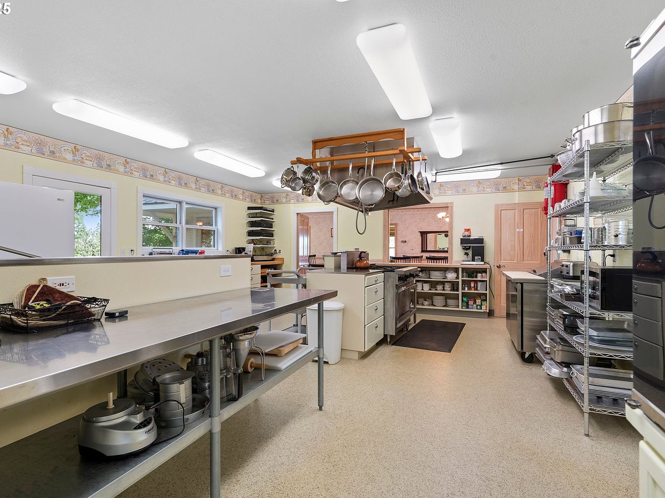 This kitchen features a spacious layout with stainless steel countertops and an island, ideal for food preparation. The cabinetry is a soft cream, enhancing the airy feel, while the walls are decorated with a subtle, vintage-inspired wallpaper border. A series of overhead fluorescent lights brighten the room. Pot racks hang from above, showcasing an array of cookware. Nearby, heavy-duty shelving keeps kitchen tools and appliances accessible. The flooring appears durable and easy to maintain. Large windows invite natural light in, adding warmth and a view of the outdoors, creating an inviting cooking environment.