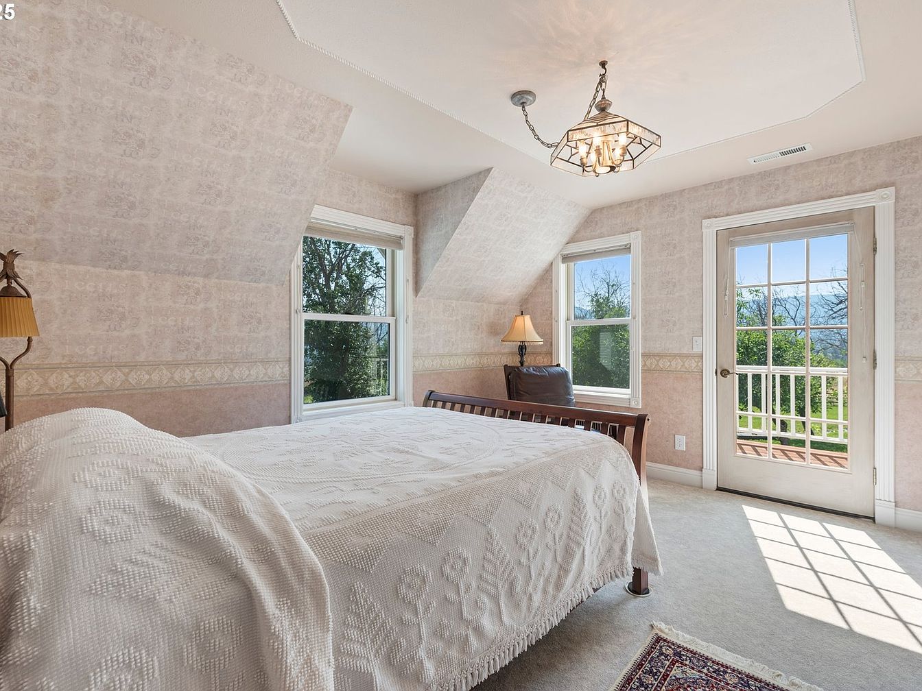 A cozy bedroom features a soft color palette of pale pink wallpaper adorned with delicate patterns and a subtle texture. Angled walls create a charming atmosphere, enhancing the room’s character. A wooden bed, dressed in a textured white bedspread, takes center stage. A small bedside lamp on a decorative stand provides warm lighting. Natural light pours in through two large windows, highlighting the verdant views outside. Opposite the bed, French doors open onto a small balcony, inviting fresh air. A traditional rug adds warmth to the carpeted floor, pulling together the room’s vintage-inspired aesthetic.