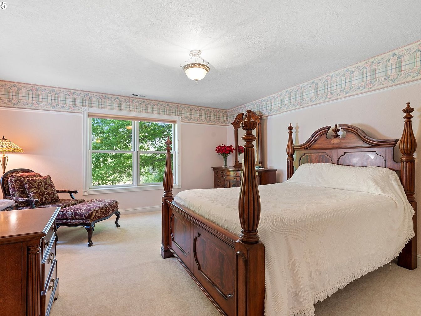 This elegant bedroom features a classic four-poster wooden bed with intricate carvings, dressed in a crisp white coverlet. A cozy armchair, upholstered in rich burgundy floral fabric, complements the room’s warmth. Light softens through a large window, framed by white trim, providing views of lush greenery outside. The walls showcase subtle pastel wallpaper with a delicate pattern, accented by a decorative border. A matching wooden dresser adds to the traditional aesthetic, adorned with a small vase of red flowers. The plush carpet underfoot enhances comfort, while a tradition-style chandelier casts a gentle glow throughout the space.