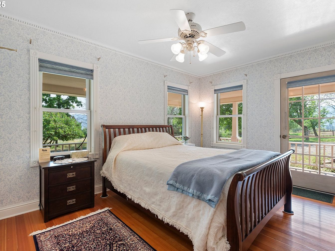 This charming bedroom features a classic wooden bed showcasing a slatted design, with a light-colored quilt neatly draped over it. The walls are adorned with delicate floral wallpaper, providing a soft and inviting atmosphere. Light streams through large windows dressed with subtle shades, highlighting the hardwood floor’s warm tones. A dark wood nightstand with three drawers holds a few decorative items, adding functionality and style. Beside it, a slender floor lamp casts a cozy glow. A small area rug, rich in traditional patterns, anchors the space, contributing to its timeless elegance and comfort.