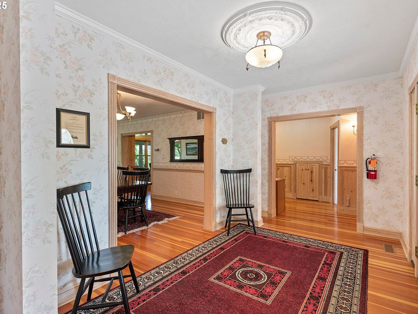 A welcoming entryway featuring floral-patterned wallpaper in soft pastel hues. The space showcases rich wooden flooring that contrasts beautifully with a traditional Persian-style rug boasting intricate red and black patterns. Two black rocking chairs flank the entrance, providing a cozy touch. An ornate ceiling medallion surrounds a vintage light fixture, enhancing the room’s character. Arched doorways lead to adjoining rooms, with one showcasing elegant paneling. A framed certificate adds a personal touch to the wall. The overall aesthetic balances historical charm with functional design, creating an inviting atmosphere that hints at the home’s rich heritage.