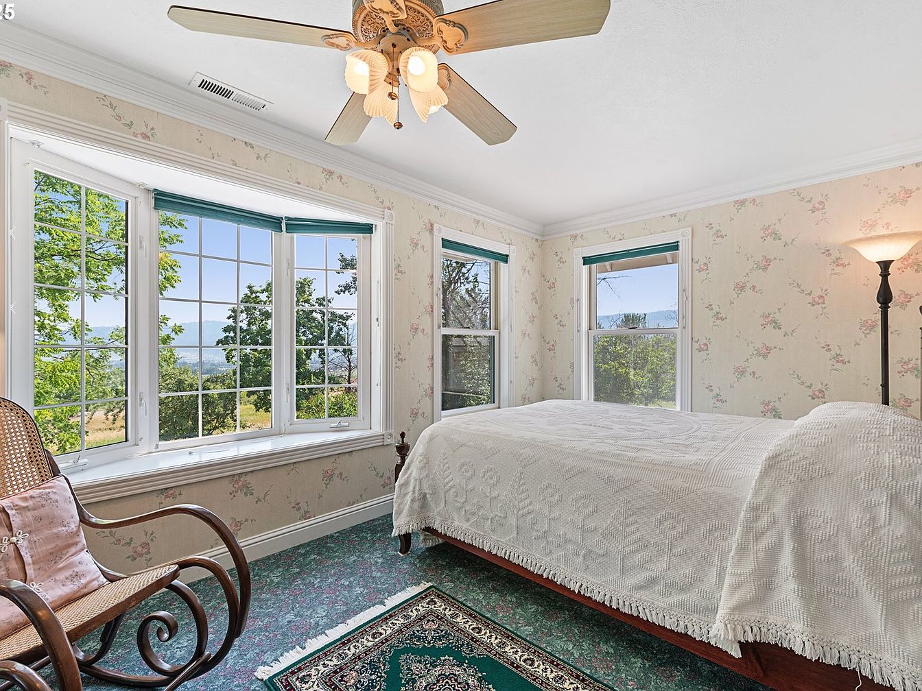 A cozy bedroom featuring pastel floral wallpaper that adds a touch of vintage charm. A large bay window is adorned with green accents, offering plenty of natural light and views of the surrounding landscape. The room showcases a solid wood bed covered with a textured white quilt and a hint of a luxurious woven throw at the foot. A dark wooden bedside table complements the furnishings, while a traditional floor lamp provides soft illumination. A comfortable rocking chair with a patterned cushion invites relaxation, and an intricate area rug adds warmth to the space, harmonizing with the green and earthy tones.