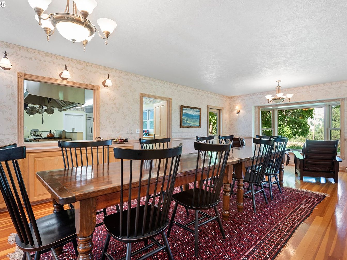 A spacious dining room featuring a long wooden table surrounded by black spindle-back chairs. The table’s rich, dark finish contrasts with the warm, honey-toned hardwood floor, which adds a cozy feel to the space. Soft floral wallpaper adorns the walls, complemented by a light-colored chair rail. A large window allows natural light to flood in, showcasing the lush greenery outside. Decorative light fixtures hang from the ceiling, including a central chandelier with elegant glass globes and wall sconces, enhancing the room’s inviting atmosphere. An intricate red area rug adds texture beneath the table, tying the space together.