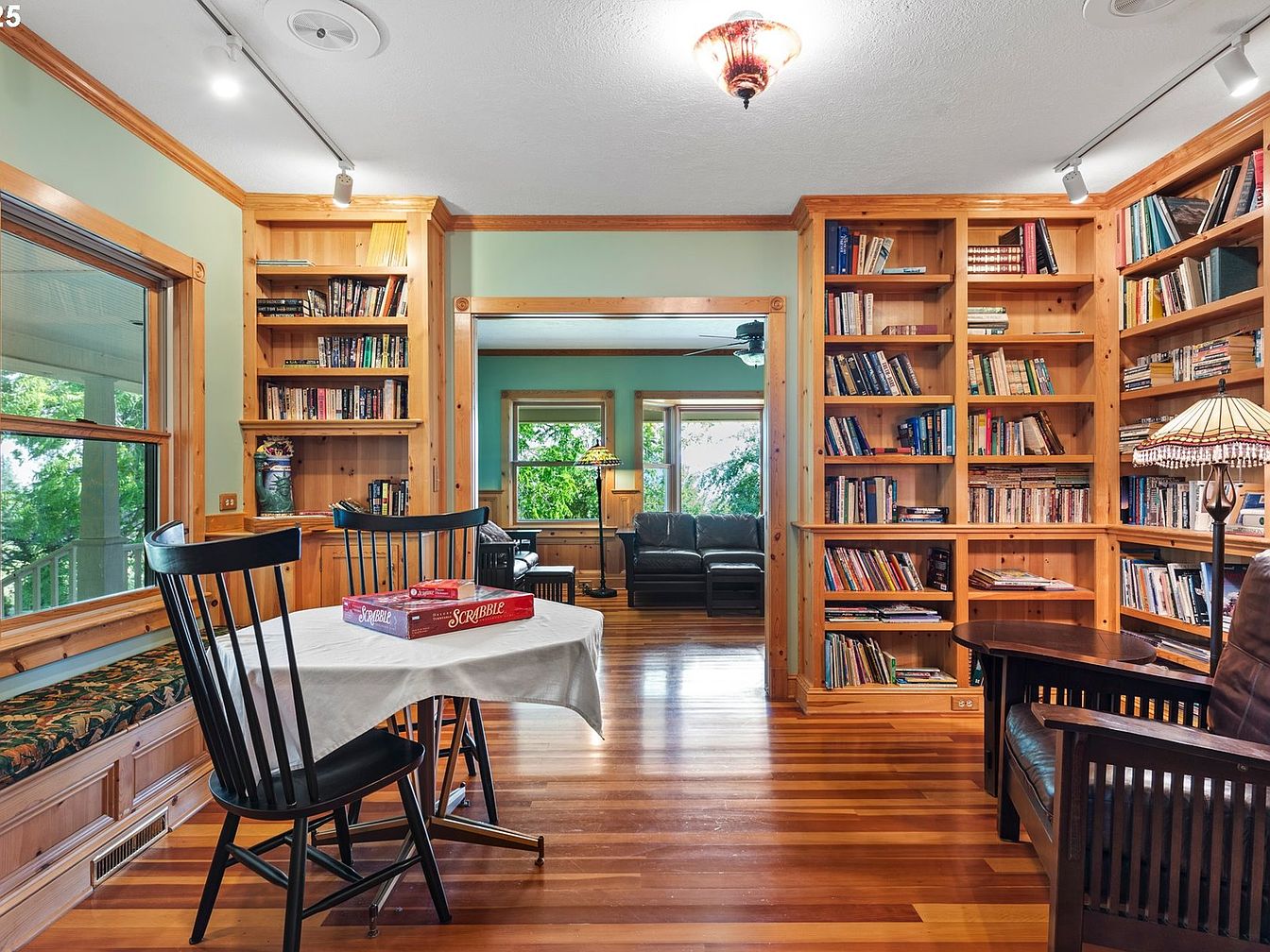 A cozy corner featuring built-in wooden bookshelves filled with a variety of books. The wall has a soothing light green color, enhanced by warm wood accents framing the windows. A small table draped with a white cloth sits in the center, accompanied by black spindle-back chairs, suggesting a space for games or quiet reading. Natural light floods in through large windows, creating an inviting atmosphere. An antique-style lamp with a stained glass shade adds charm. Rich wooden flooring showcases a rich grain, while a plush chair in the background invites relaxation, contrasting with the vibrant greenery outside.
