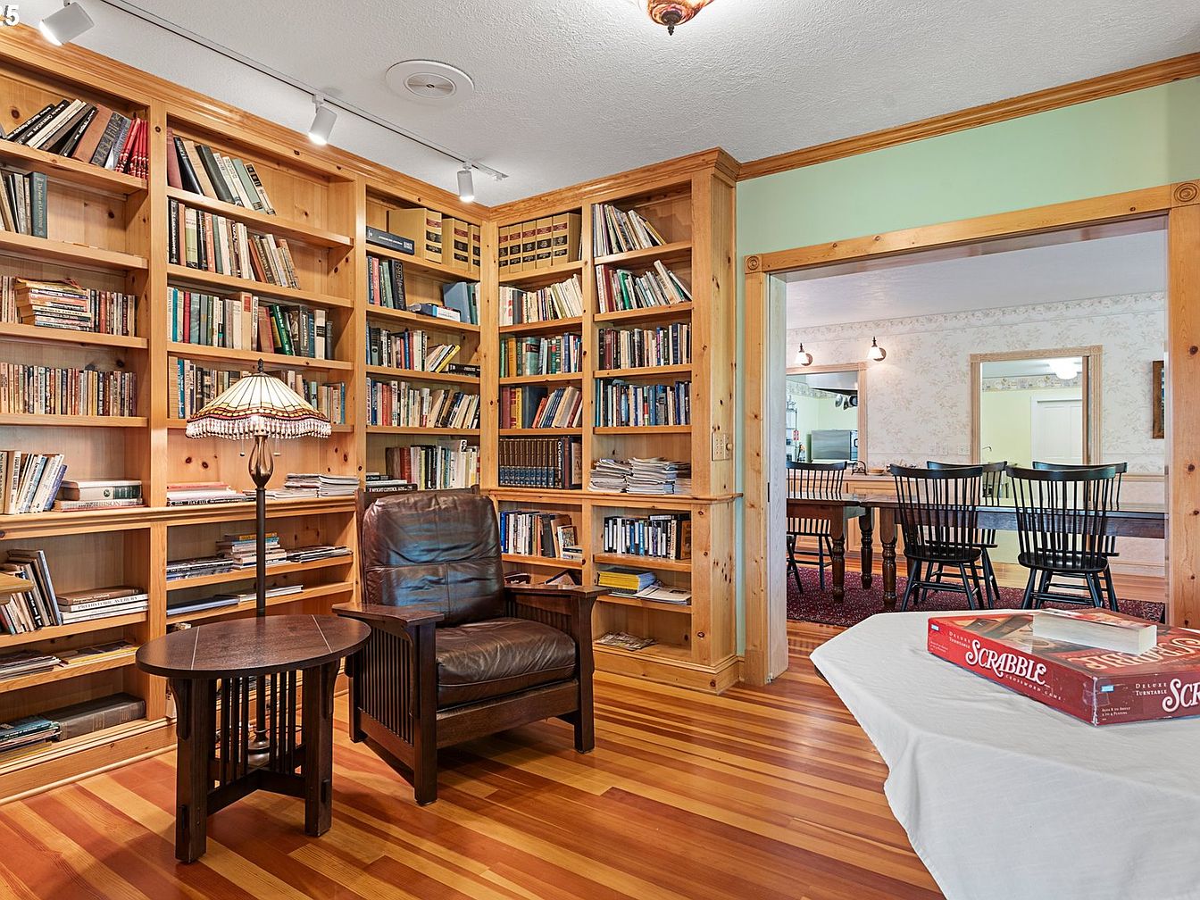 A cozy library nook features extensive wooden shelving filled with an array of books, showcasing a love for literature. A rich, dark leather armchair invites relaxation beside a small wooden side table. Above, a stained glass lamp adds a warm glow, enhancing the inviting ambiance. The warm wooden floors contrast beautifully with the soft green wall paint. An open passageway reveals a dining area, featuring a large table and black spindle-back chairs, hinting at the home’s social nature. The design marries functionality with comfort, offering a perfect space for reading or gathering.