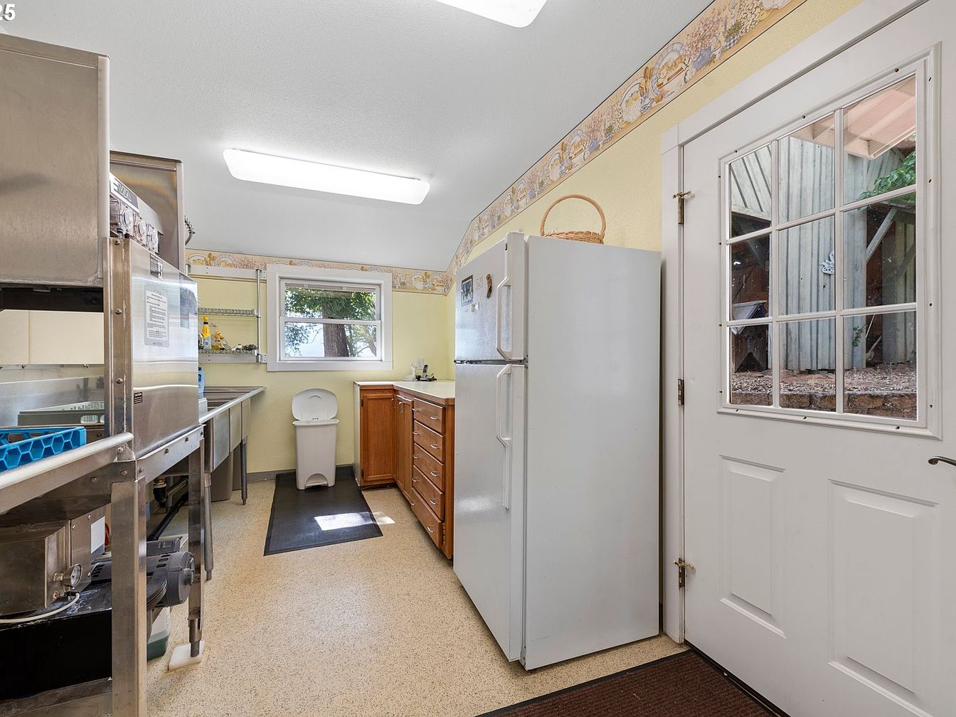 This kitchen area features a functional layout with practical elements. The walls are painted a soft yellow, offering warmth, while a decorative border adds a charming touch near the ceiling. A stainless steel prep station is prominent, alongside ample wooden cabinetry showcasing a natural wood finish. A white refrigerator stands against the wall, adding a modern contrast. The room includes a large window that invites natural light, providing views of the outdoors. A dark mat lies along the floor, contrasting with the light-colored floor tiles. Overall, the space balances functionality with a welcoming atmosphere.