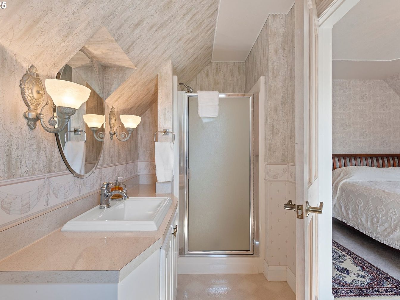 This cozy bathroom features a sloped ceiling with textured wallpaper that adds warmth. An elegant sink with polished countertop complements vintage fixtures. Two wall-mounted sconces provide soft lighting, enhancing the reflective surface of the round mirror above the sink. The space is accented with delicate wallpaper trim depicting soft drapery patterns. A glass shower stall offers a modern touch, contrasting subtly with the classic design elements. The light color palette, including creams and soft pastels, creates a serene atmosphere. The door slightly ajar reveals a hint of the adjoining bedroom, blending functionality and charm.