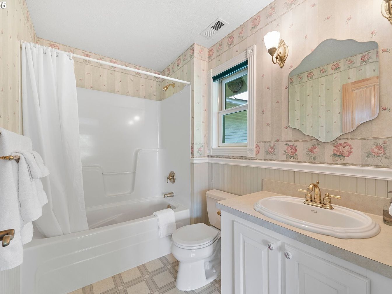 A cozy bathroom featuring floral wallpaper with soft pastel shades, creating a cheerful ambiance. The layout includes a white tub with a shower curtain, complementing the tub’s finish, while brass fixtures add a touch of elegance. A single-sink vanity with a scalloped edge countertop provides functional space, accented by delicate hardware. To the left, a white toilet sits snugly against the wall. Natural light filters through a small window, enhancing the airiness. Decorative sconces frame the mirror above the vanity, providing ample illumination. The tile floor is patterned in a classic grid, tying together the vintage charm of the space.