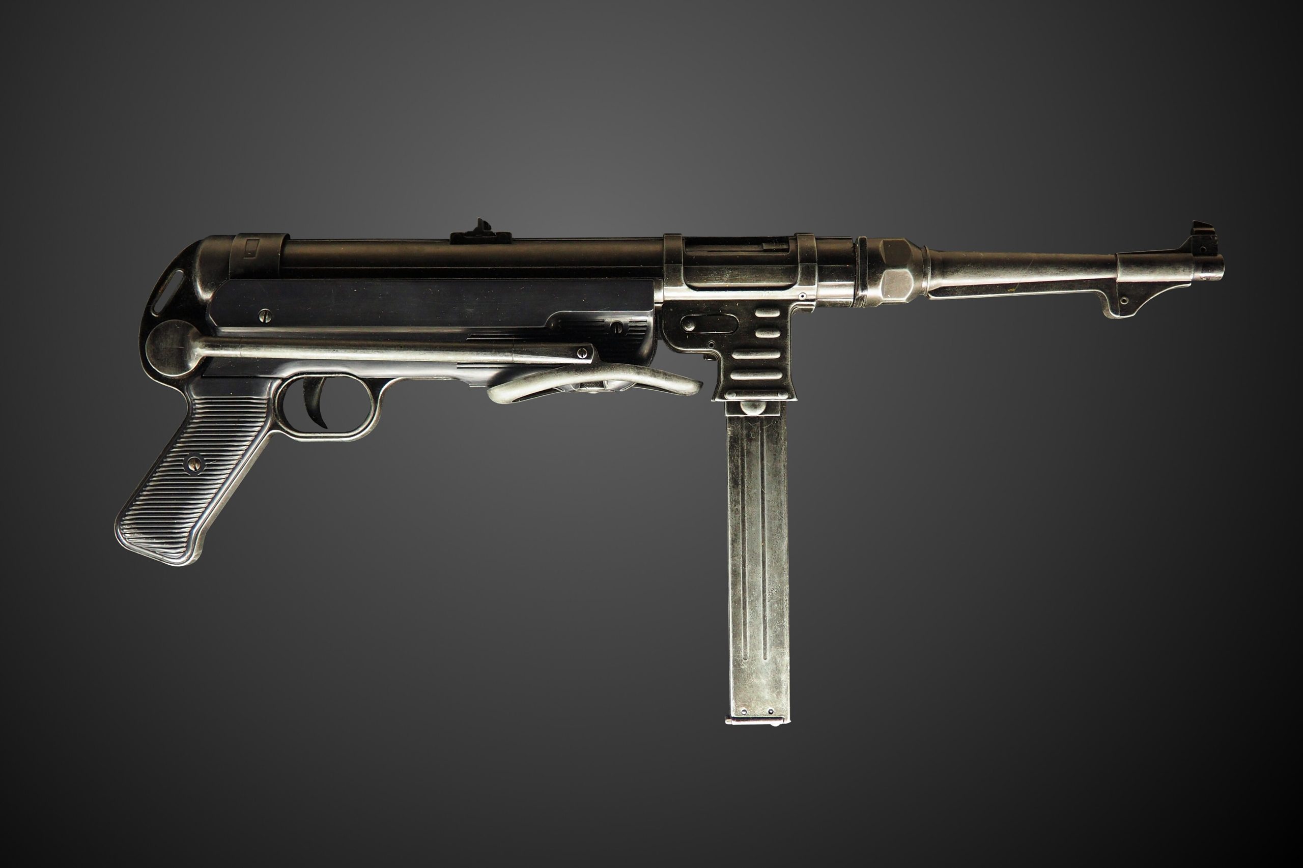 The MP40/I was an experimental evolution of Germany’s iconic MP40, retaining its under-folding steel stock while introducing a dual side-by-side magazine system. Chambered in 9×19mm Parabellum, it operated via simple blowback and fired from an open bolt. The goal was to double available ammunition before reloading, a response to intense close-quarters combat. While innovative, the added weight and balance issues limited acceptance. Only small trial batches were produced during World War II, and most were lost or dismantled after the conflict. Visually, it stands out immediately due to its widened magazine housing. Surviving examples are extraordinarily scarce and usually confined to major museums. Its importance lies in showcasing wartime desperation paired with creative engineering under extreme pressure.