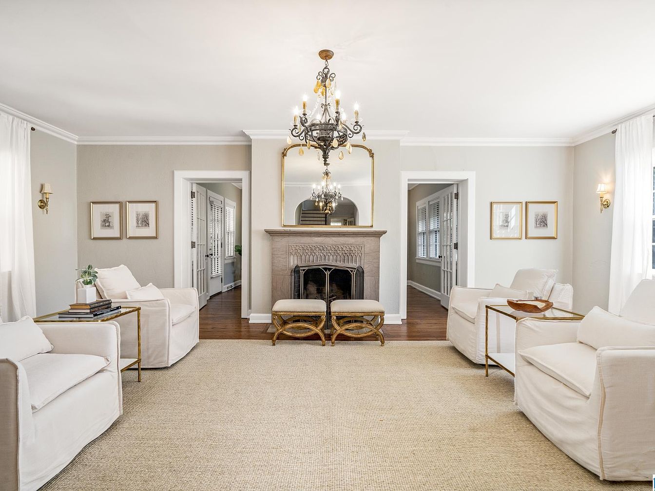 Warm hardwood floors lead from a bright entryway, where a red-paned wooden door opens to an enclosed brick porch area. Ahead, a stately archway frames the living room, showcasing classic architectural lines and soft beige walls. A traditional fireplace with a light stone mantle sits beneath an ornate gold-framed mirror, complemented by a grand chandelier. Two small upholstered benches rest before the hearth, while elegant white armchairs and a light rug soften the space. Subtle white crown molding, wide doorways, and abundant natural light enhance the historic and welcoming ambiance of this home’s entrance and living area.