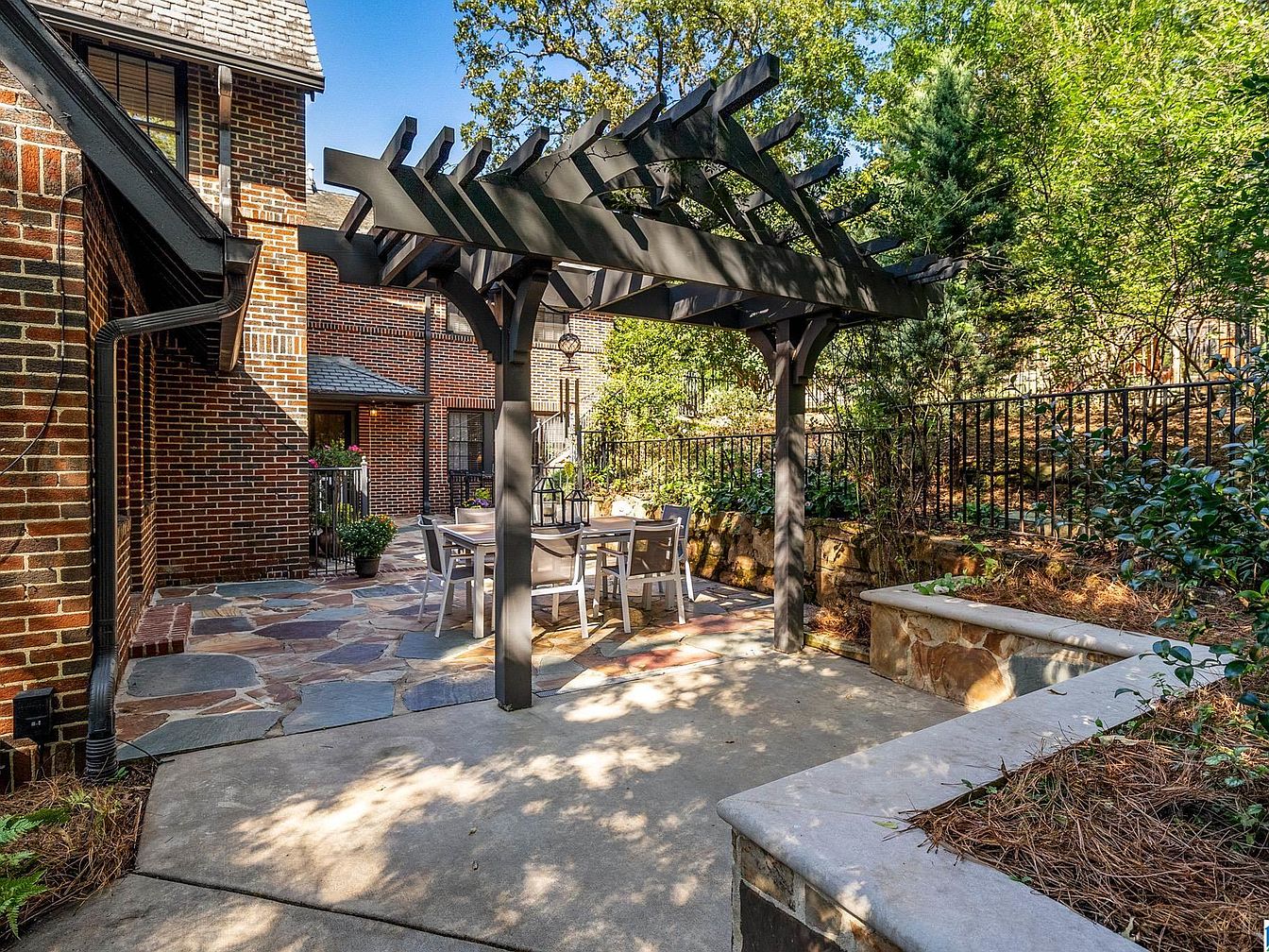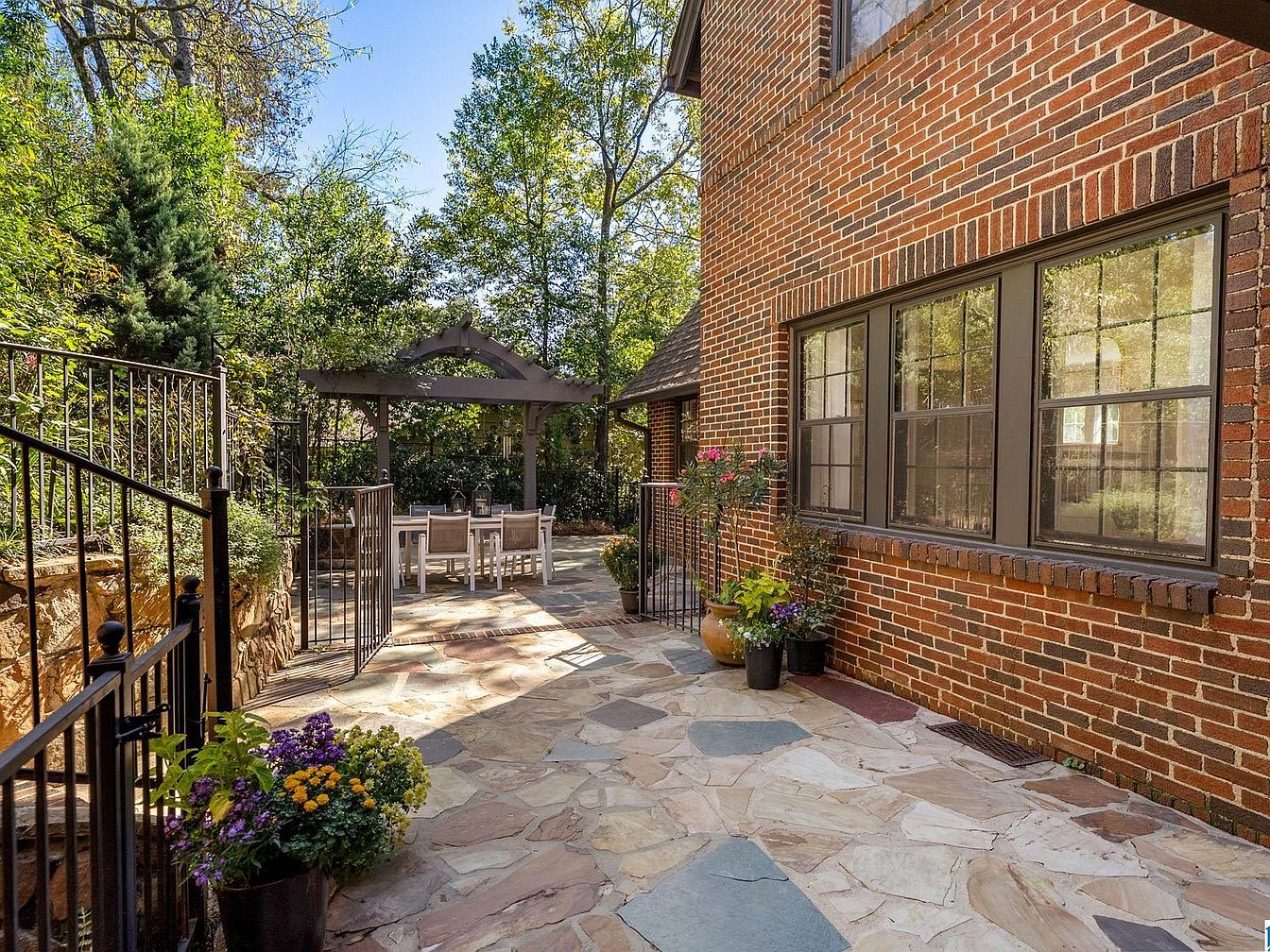 A spacious stone patio sits alongside a historic brick home, with a classic red and dark brown brick exterior. The patio flooring features irregularly shaped flagstones in neutral beige and gray hues. Black iron railings create a sense of enclosure, while potted plants and flowers add natural color and charm. Beyond the main area, a charming wooden pergola provides shade over a white rectangular dining table surrounded by white outdoor chairs. Lush greenery and mature trees offer a private, tranquil atmosphere, filtered with sunlight and framed by rustic yet inviting landscaping elements.