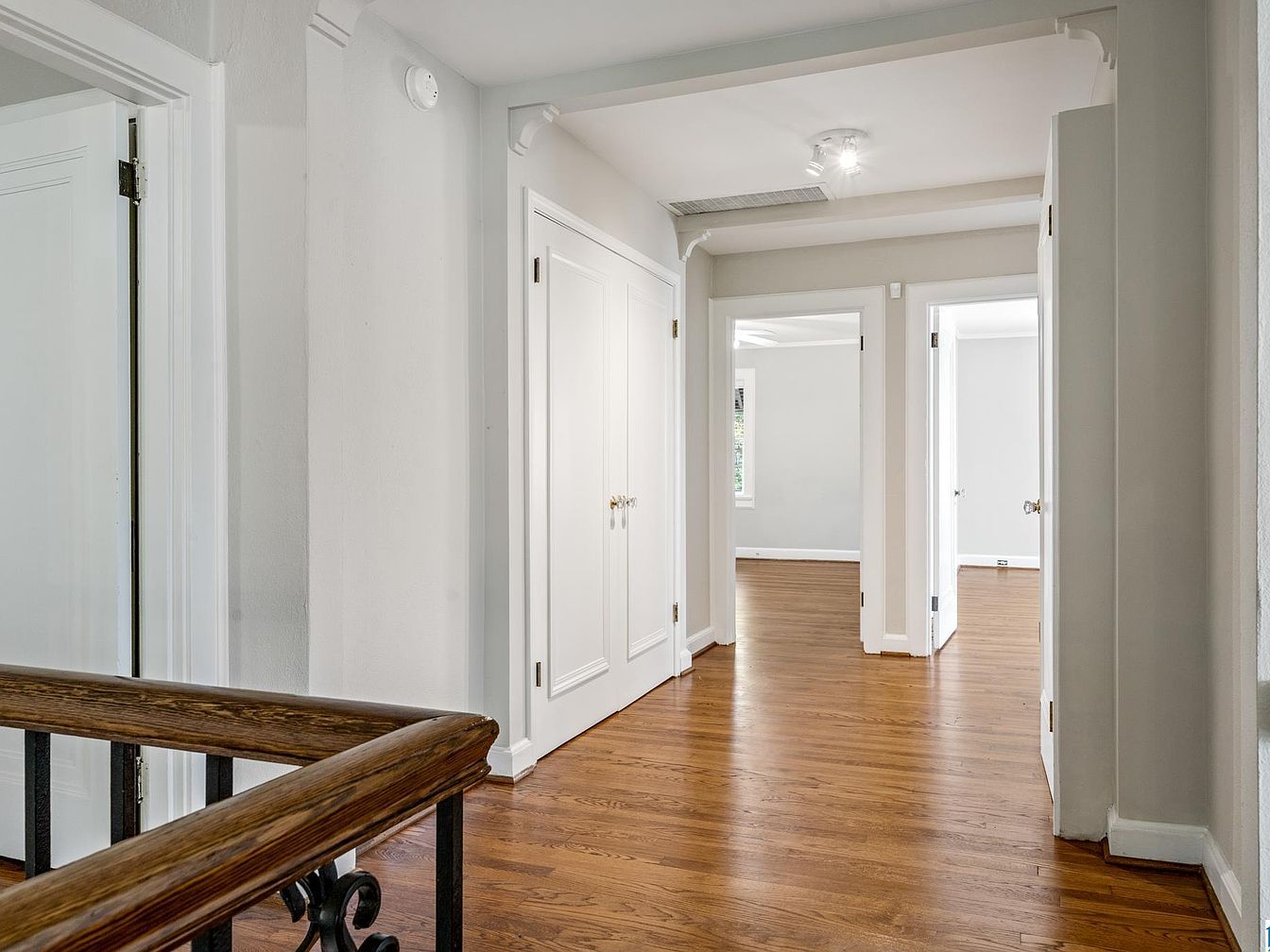 A wide upstairs hallway features warm, medium-toned hardwood floors that lend an inviting and classic sense to the space. White walls and trim create a bright, airy atmosphere, enhanced by natural light flowing through open doorways leading into adjacent rooms. Double closets with gold hardware sit directly ahead, offering efficient storage, while the ceiling shows subtle crown molding accents for a hint of historic character. A simple light fixture and exposed air vent add utility without detracting from the clean lines. The wooden handrail with wrought-iron balusters on the left contrasts elegantly against the light color scheme, reinforcing a refined yet understated aesthetic.