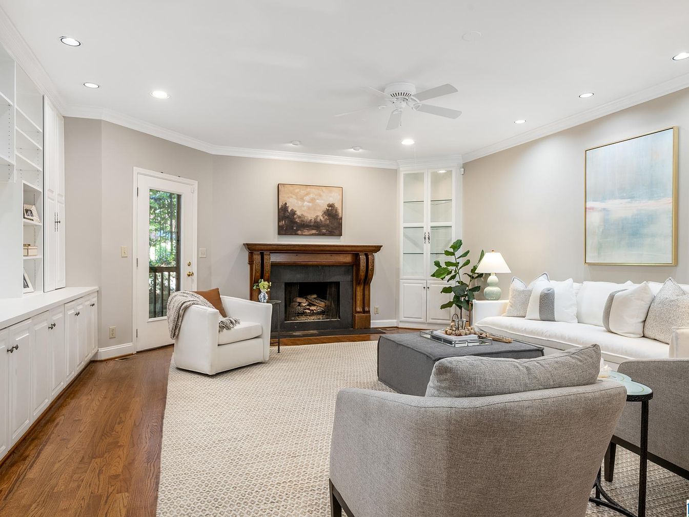 A bright living room with soft beige walls and abundant recessed lighting creates a welcoming feel. An elegant dark wood mantel anchors the fireplace, topped by a moody landscape painting. Glass-front built-in cabinets flank the fireplace, providing classic storage and display options. The room features a large off-white area rug atop warm hardwood floors, tying together contemporary gray and white upholstered seating—a sofa and two modern armchairs. A square charcoal ottoman acts as a coffee table, topped with a decorative tray. Additional aesthetics include airy crown molding, minimalist artwork, potted greenery, and a door opening to an outdoor space.