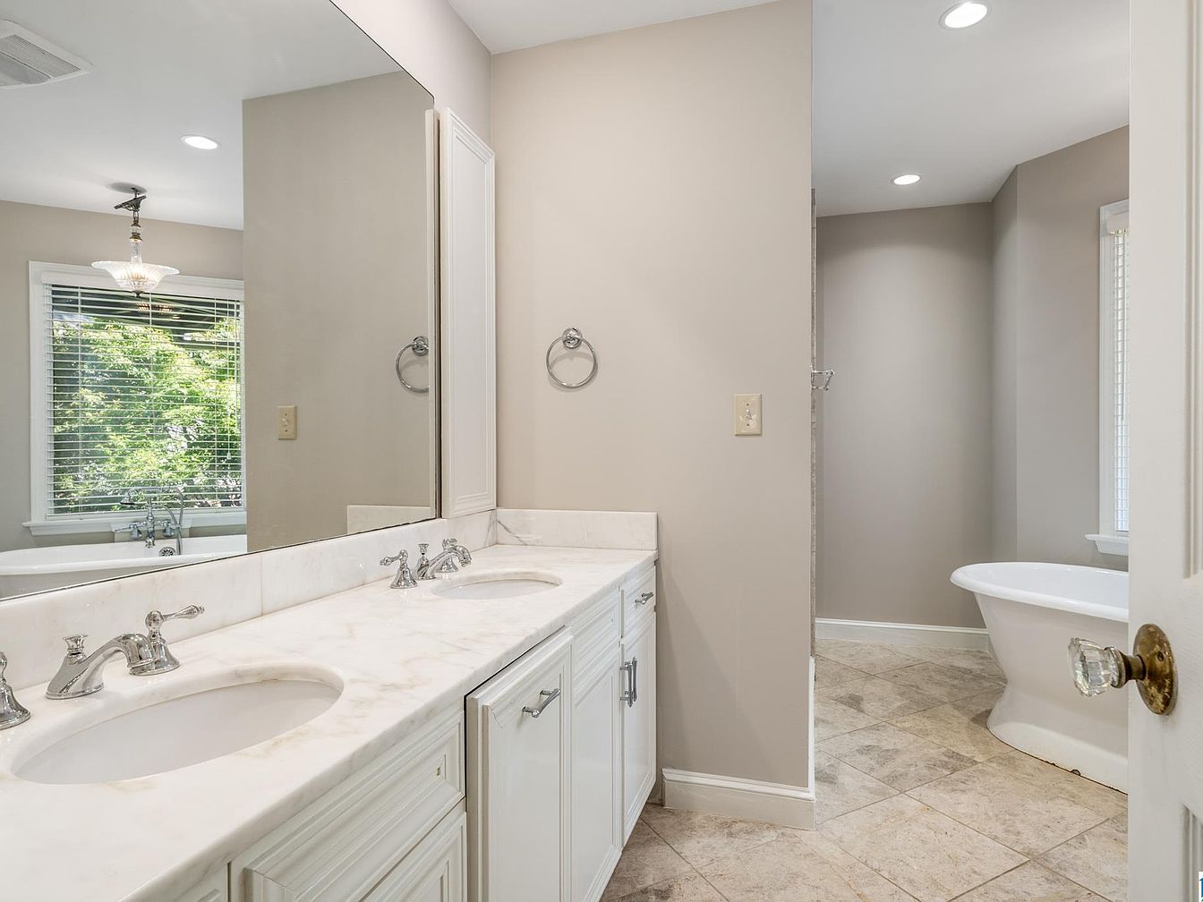 A bright bathroom features a double vanity with a marble countertop and undermount sinks, paired with silver faucets and cabinet hardware. The cabinetry is painted white, contributing to a fresh and clean atmosphere. Soft beige walls and warm beige tiled flooring create a calming, neutral palette throughout the room. A large mirror runs the length of the vanity, visually expanding the space. Natural light streams in from a window with white blinds, offering a view of green foliage outside. In the corner sits a classic white freestanding bathtub, adding a touch of elegance and comfort to the room’s design.
