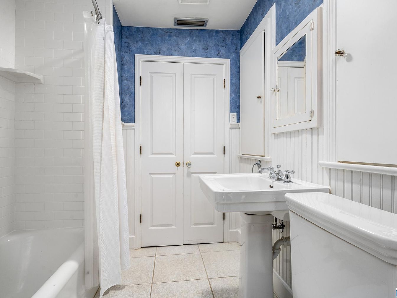 The space features a classic bathroom layout with a white porcelain pedestal sink and toilet on the right, set against white beadboard wainscoting that adds a touch of traditional charm. Above the sink is a mirrored medicine cabinet with a simplistic frame. Blue textured wallpaper covers the upper part of the walls, creating a crisp contrast with the clean lines of the white lower walls and cabinetry. A white tiled shower-tub combination sits to the left, enclosed by a simple white shower curtain. The room’s double door closet and soft neutral floor tiles contribute to a bright, fresh, and inviting atmosphere.