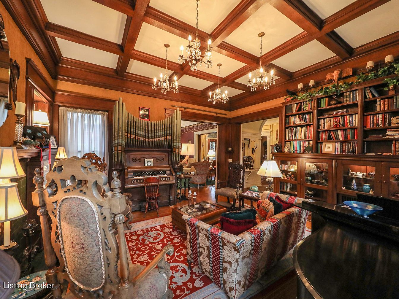 This living room features an elegant coffered ceiling with wooden beams, enhancing its historic charm. The warm, rich tones of the wooden walls complement the ornate furniture. A classic patterned red and cream area rug adds warmth and texture to the space. A vintage organ serves as a striking centerpiece along one wall, surrounded by plush seating options, including an intricately carved armchair. Decorative bookshelves, filled with books and mementos, line another wall, while table lamps cast soft lighting. The overall design melds comfort with sophistication, inviting relaxation and conversation in a timeless setting.