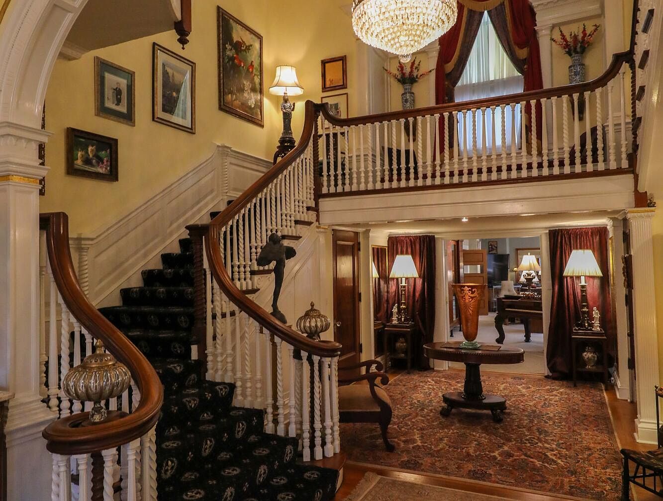 This foyer features an elegant curved staircase, leading to a balcony above. The walls are adorned with various framed artworks that enhance the classic charm. A large, sparkling chandelier hangs from a lofty ceiling, illuminating the space. Rich, dark wood elements, including doors and railings, contrast with the soft yellow walls. The stair carpet displays intricate patterns, complementing the warm tones of an ornate area rug below. Stylish table lamps with soft shades provide additional lighting, highlighting decorative accents and creating a welcoming atmosphere. The overall aesthetic blends historic sophistication with inviting warmth.