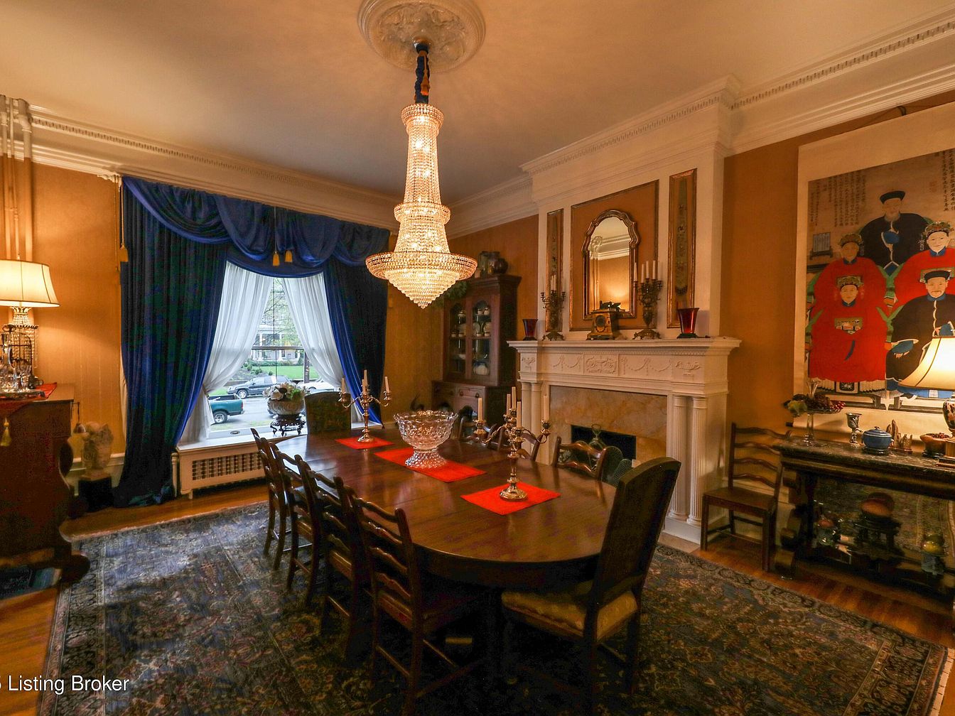 This elegant dining room features a long wooden table surrounded by dark, classic chairs. A crystal chandelier hangs from the ceiling, providing a warm glow that highlights the plush, textured walls painted in a soft golden hue. Rich blue drapes frame the large window, accented with delicate white sheers. A detailed fireplace with intricate trim sits against the wall, topped with decorative candles and a mirror. An ornate rug adds an element of coziness to the hardwood floor. Artwork and tasteful decorations enhance the sophisticated atmosphere, reflecting a blend of historical charm and luxurious design.