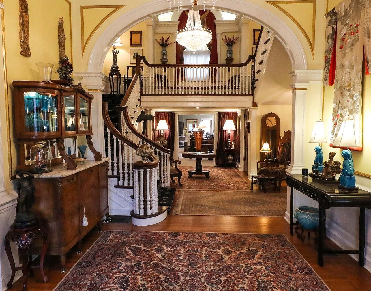 The entryway features a grand wooden staircase with intricately carved balusters, leading to an upper level. Rich, warm tones dominate the space, with golden yellow walls adorned with white trim, enhancing the historic charm. A large, ornate table stands center stage, topped with a striking copper vase. Decorative elements like sconces provide subtle lighting, while a large area rug adds warmth to the polished hardwood floors. The dual front doors framed by tall windows invite natural light into the space, creating an inviting atmosphere. Vintage furniture pieces, including an elegant armchair, complement the traditional aesthetic.