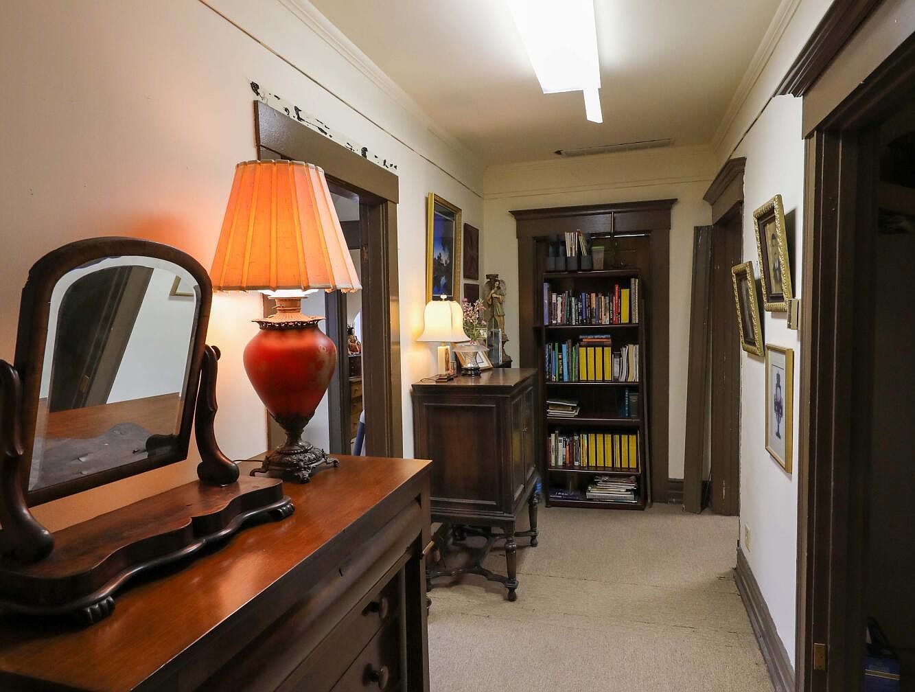 This hallway features warm tones and vintage elements, creating an inviting atmosphere. The wooden dresser, with a dark finish, hosts an ornate mirror and a striking red lamp that adds a soft glow. A small bookcase lined with colorful books offers a glimpse of intellectual warmth. The walls adorned with framed artwork provide a nostalgic touch, while the plush carpet adds comfort underfoot. The architectural details include decorative moldings and classic door frames, enhancing the historic charm. The layout invites exploration, leading to various rooms, while the ambient lighting complements the cozy overall aesthetic.