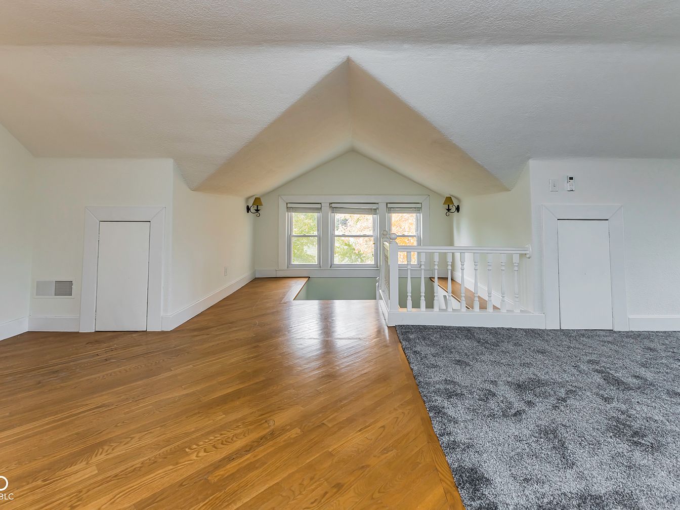 A spacious attic loft with a pitched ceiling painted white, creating a bright and airy feel. The floor transitions from rich wood planks to plush gray carpeting, dividing the area into zones that could serve as both a cozy lounge and a work or reading nook. At the far end, three windows let in natural light and offer views of leafy trees outside. Small wall sconces with gold shades and simple white baseboards contribute to the understated elegance. Two small, door-like accesses are integrated into the side walls, likely for storage space, maintaining a clean and functional look.