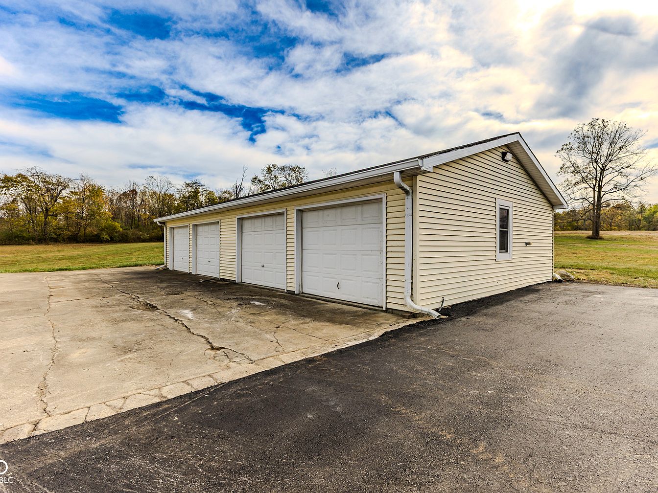 A large, three-bay detached garage sits on a spacious lot surrounded by open grassy fields and wooded areas in the distance. The building features light beige vinyl siding, white trim, and three matching white overhead doors, each with a row of panels. A single window with white trim is located on the shorter side wall. The garage is bordered by a wide, cracked concrete driveway that blends into fresh black asphalt on one side, providing ample parking space. The clean, simple architecture and muted color scheme blend into the natural surroundings, with a bright sky and scattered clouds overhead.