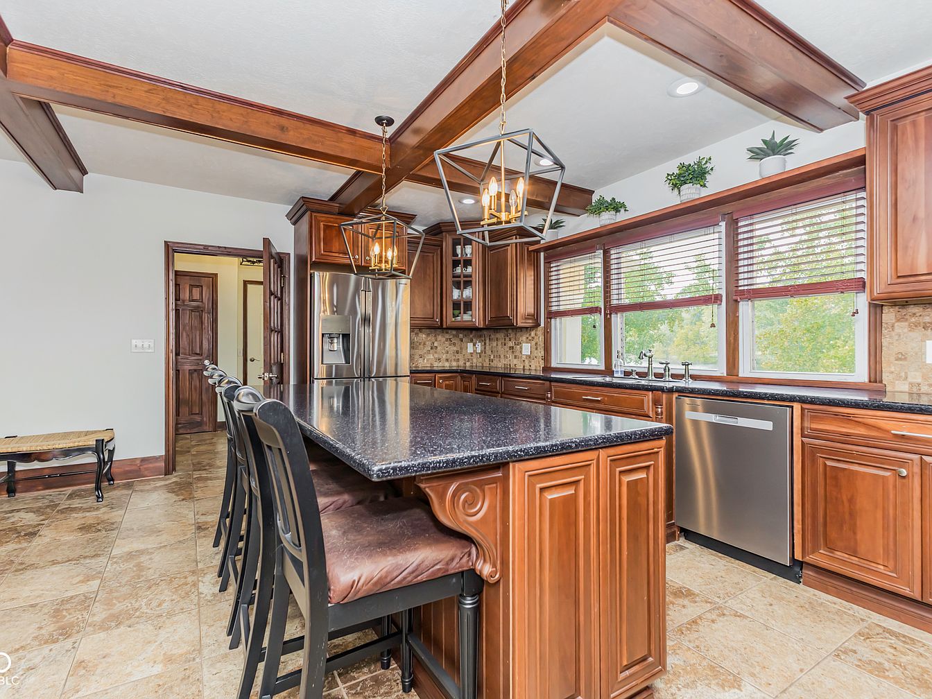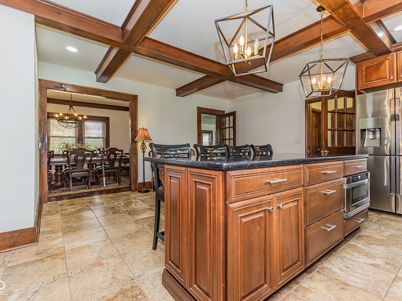 Spacious kitchen with natural tile flooring and warm wooden cabinetry. A large central island features black granite countertops and a row of three high-backed chairs, creating a casual eating area. The ceiling highlights exposed wooden beams and two modern geometric chandeliers, casting warm, ambient light. Stainless steel appliances, including a refrigerator, line the right wall. Through an open doorway trimmed in wood, an adjacent formal dining room is visible, showcasing a heavy wooden table, matching chairs, a dark area rug, and a candle ring chandelier. Earth tones and traditional design create a welcoming, classic atmosphere.