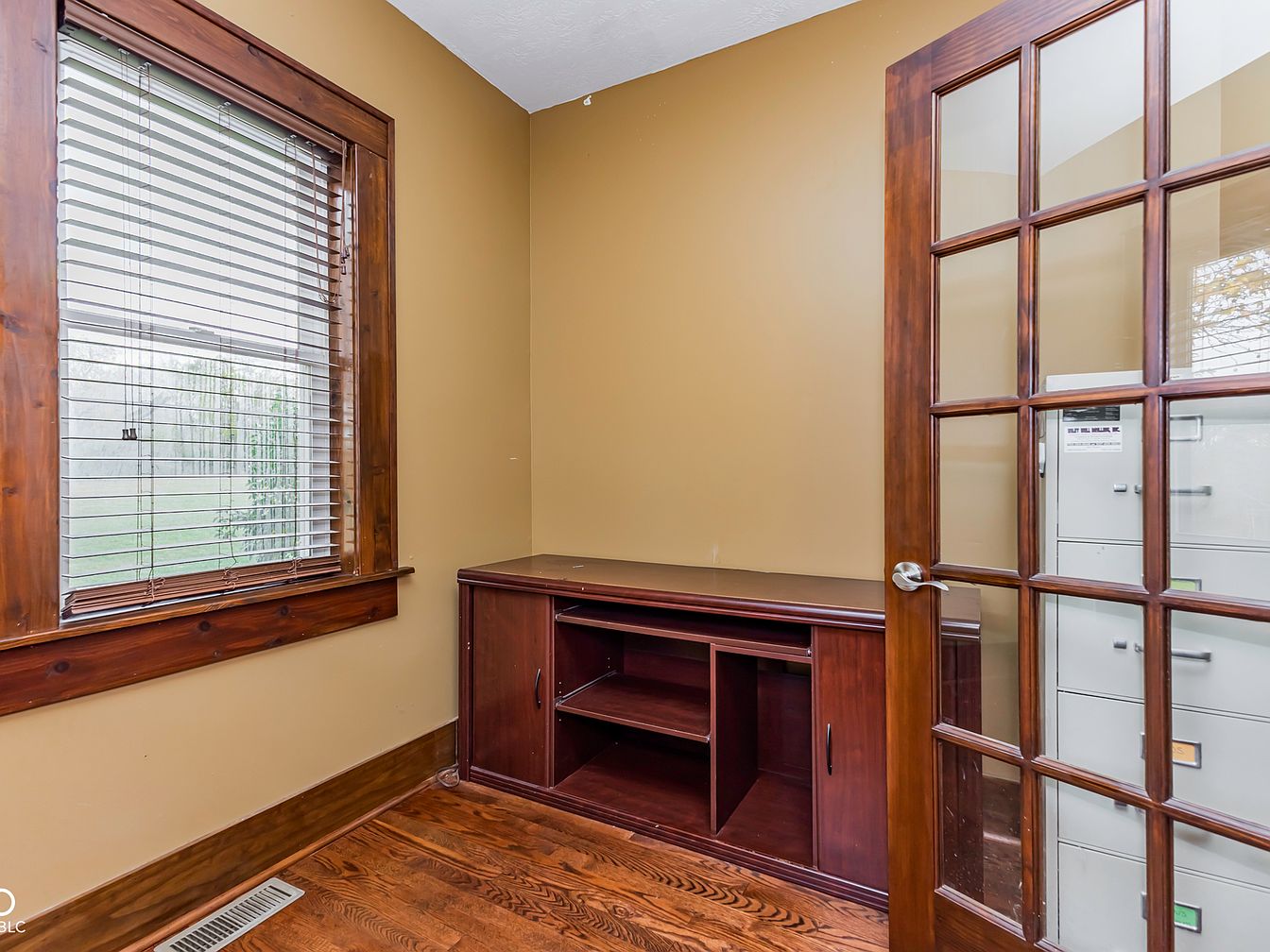 A compact office or study area with warm tan walls and medium-tone hardwood flooring. The room features a large window with wooden trim and horizontal blinds, bringing in natural light and providing a view of the outdoors. A dark wood cabinet with shelving sits against the wall, offering space for storage or electronics. The entrance is framed by a French door with multiple glass panes, matching the room’s stained woodwork and baseboards. A metal filing cabinet is partially visible by the doorway, complementing the workspace’s practical and organized character, all set in a classic and slightly rustic style.