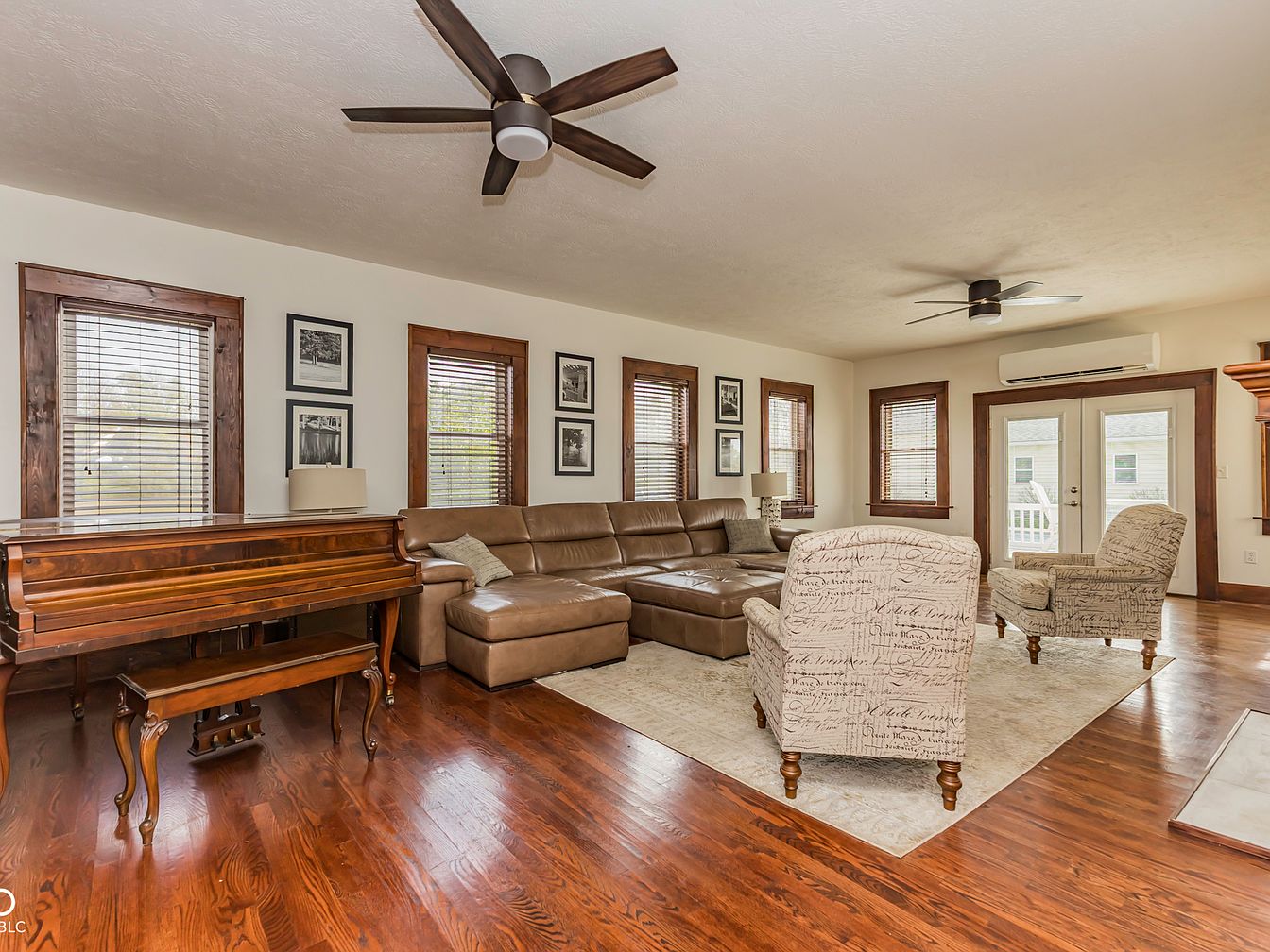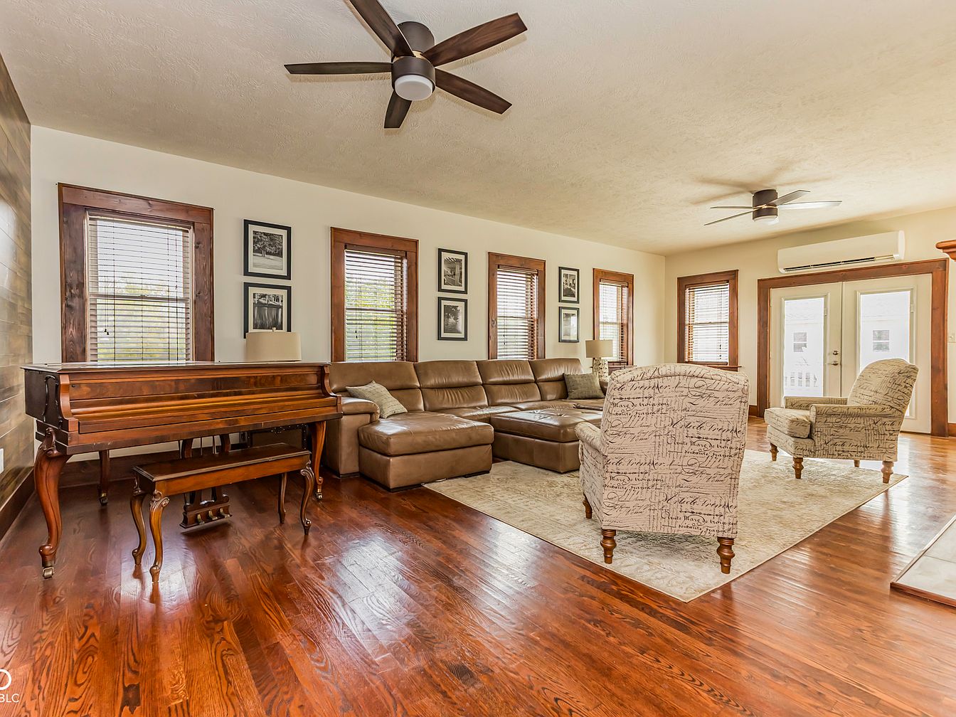 This spacious living room features rich, reddish-brown hardwood floors and large windows framed by dark wood trim, allowing ample natural light. Against one wall sits an elegant dark wood piano with a matching bench, adding a classic touch. The centerpiece is a large, L-shaped leather sectional sofa in warm tan tones, offering comfortable seating. Two upholstered armchairs with script print fabric face the sofa, all arranged atop a neutral area rug. Neutral wall colors complement the wood details throughout, and black-and-white framed photographs add character. Dual ceiling fans in dark brown blend with the inviting, traditional aesthetic. French doors lead outside, enhancing the room’s airy ambiance.