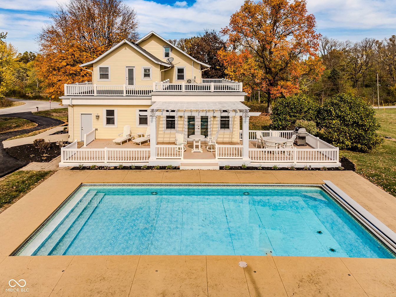 An inviting outdoor area beside a large rectangular swimming pool, bordered by smooth concrete decking. The two-story historic house features pale yellow siding, crisp white trim, and a grey shingled roof. A white pergola shades a spacious patio, furnished with several white chairs and a small table, offering a comfortable spot for lounging. Wide railings frame both the upper and lower decks. Mature trees with orange and gold autumn foliage ring the expansive, neatly manicured lawn, and a winding driveway leads up to the home, emphasizing a peaceful, secluded estate atmosphere.