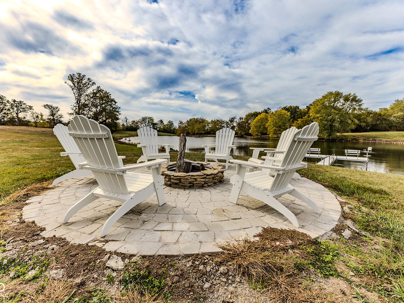 A circular stone patio set on the edge of a calm lake features five white Adirondack chairs arranged around a central stone fire pit. The area is bordered by natural grass, and the scene is framed by a tranquil lake and clusters of trees with green and golden foliage, suggesting an early autumn setting. The sky above is dramatic with fluffy clouds and ample blue peeking through, casting a peaceful outdoor atmosphere. Docks and benches can be seen along the shore, enhancing the relaxed, communal, and rustic lakeside aesthetic with inviting open spaces and natural textures throughout.