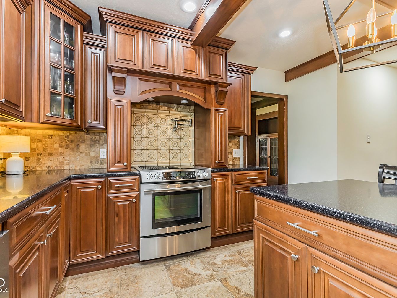 Warm wooden cabinetry anchors this kitchen with a sense of classic craftsmanship, featuring ornate raised panels and crown molding details above the stove. The color palette is dominated by rich browns from the cabinets, complemented by dark granite countertops and beige square tiled flooring. The backsplash blends small earth-toned tiles behind the counters, while larger patterned tiles accentuate the cooking area. A stainless steel oven and microwave provide modern contrast, and a soft table lamp adds a touch of ambient lighting. Recessed lights and a metal-framed chandelier offer layered illumination above the workspace and central island.