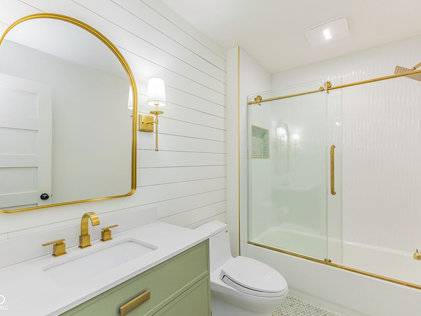 Bright, airy bathroom featuring a soft sage green vanity with brushed gold fixtures and hardware. The countertop is pure white, complementing the gold accents of the broad arch mirror above, which is paired with a wall-mounted gold and white sconce. The walls are clad in horizontal white shiplap, adding subtle texture. A frameless glass shower door is framed in gold, matching a rainfall shower head and built-in shelf. The shower’s back wall features gently undulating white tiles for delicate movement and pattern. The room exudes a modern, clean, and luxurious aesthetic with timeless, transitional style.