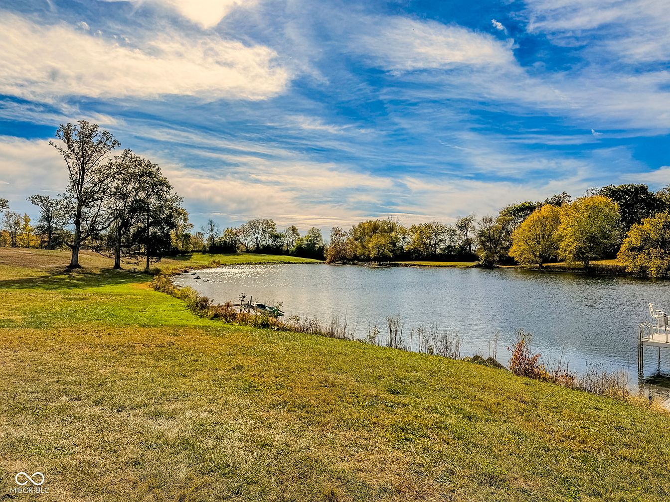 A serene backyard scene with a picturesque private lake bordered by lush grass and scattered mature trees in late autumn. The expansive lawn in the foreground gently slopes down toward the water, where the grass transitions to a mixture of reeds and low shrubs. Trees with golden and green leaves frame the scene, their leaves reflected in the calm water. To the right, a small dock with metal railings extends into the lake, suggesting access for swimming or boating. The sky is broadly open, filled with wispy white clouds set against a vibrant blue, enhancing the tranquil atmosphere.