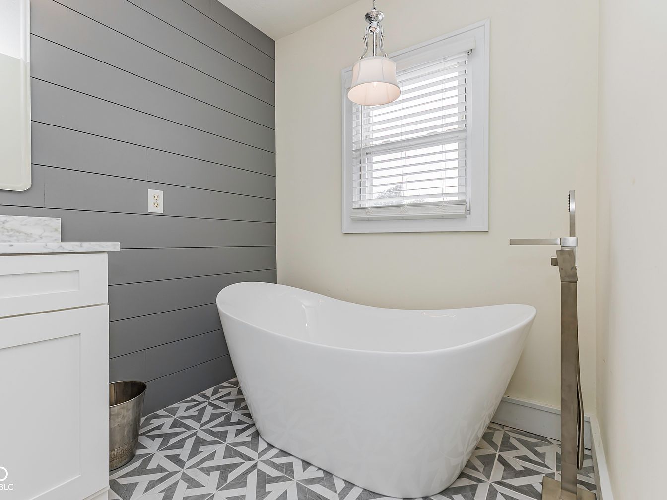 A modern, serene bathroom corner with a sculptural white freestanding tub placed against a wall of wide, grey horizontal shiplap. The opposite wall and trim are painted in a soft, creamy white, creating a contrast with the grey tones. Geometric patterned floor tiles in grey and white add visual interest and tie together the cool and warm hues. A sleek, minimalist, brushed-metal tub filler faucet stands to the right of the bathtub. Above, a single pendant light with a white opaque shade adds soft illumination. Sunlight comes through a white, slatted window, lending the space an airy and tranquil atmosphere.