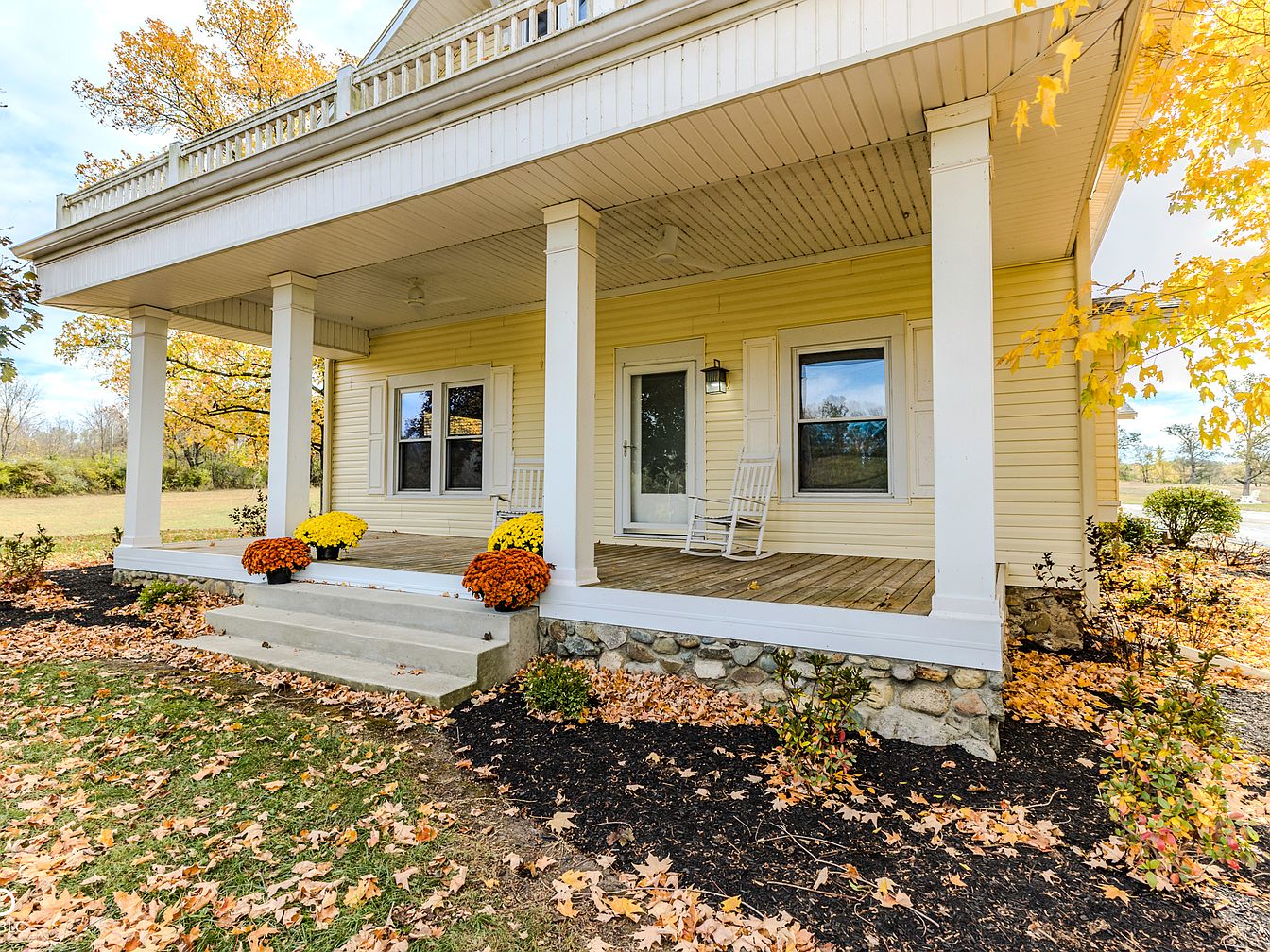 A spacious front porch stretches across the façade of a historic American home, featuring tall white columns supporting a wide overhang. The house exterior is painted a soft yellow with white trim, evoking a classic and welcoming look. Wooden rocking chairs sit near the front door, inviting relaxation. Decorative stonework forms the porch’s foundation. Bright autumnal mums in yellow and orange hues are arranged along the steps, complemented by fallen leaves scattered across the lawn and porch. The porch exudes a cozy, nostalgic charm with its open layout and scenic view of mature trees and an expansive yard.