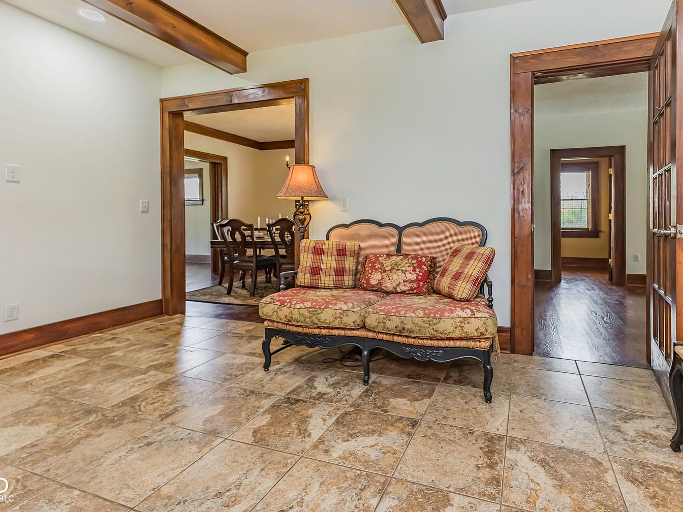 A welcoming entryway space features a small vintage upholstered loveseat with curved black wooden legs. The loveseat displays an antique style, covered in floral fabric with contrasting plaid and floral cushions, adding warmth and charm. The floor is finished with large, earth-toned tiles, complementing the natural tones of the solid wood trim framing the doorways and ceiling beams. Through open doorways, glimpses of a formal dining room with a dark wooden table and chairs, and another hallway with wood floors, are visible, demonstrating a flowing, cohesive design with a blend of earthy and classic elements.