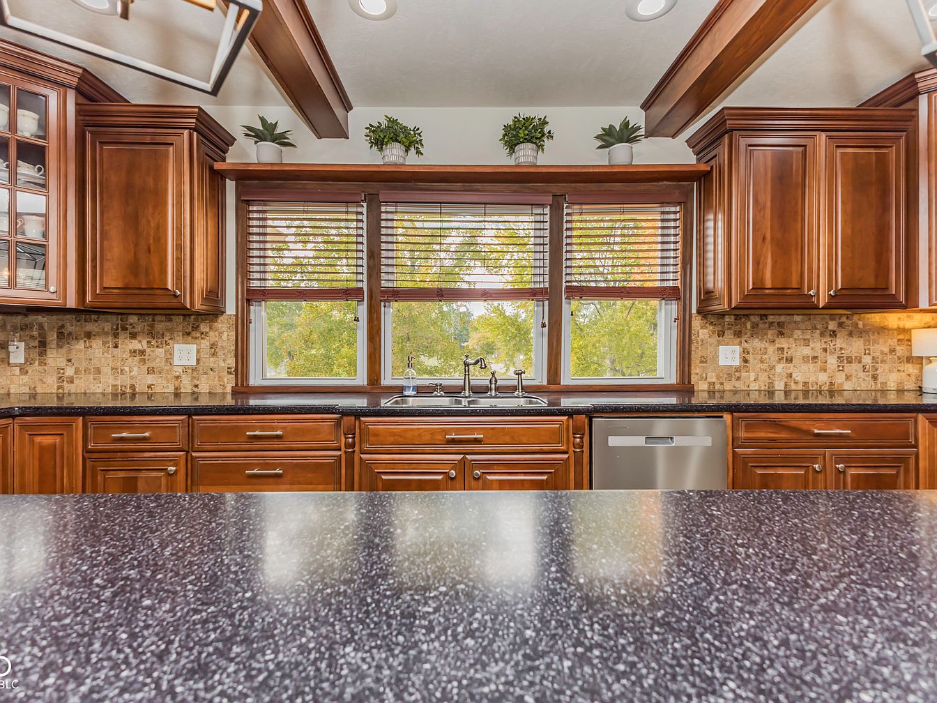 Spacious kitchen features a large, central island with dark granite countertop, surrounded by four high-backed chairs with brown leather seats. The cabinetry is a warm, rich wood with intricate molding details, complemented by matching wood beams along the ceiling. Stainless steel appliances, including a refrigerator and dishwasher, provide modern touches. Floor tiles are a creamy tan with natural stone patterns. Along the far wall, a stretch of windows with wooden blinds allows abundant natural light, and several small potted plants are arranged on the windowsill for a touch of greenery. Two geometric pendant lights hang above the island, providing stylish illumination.