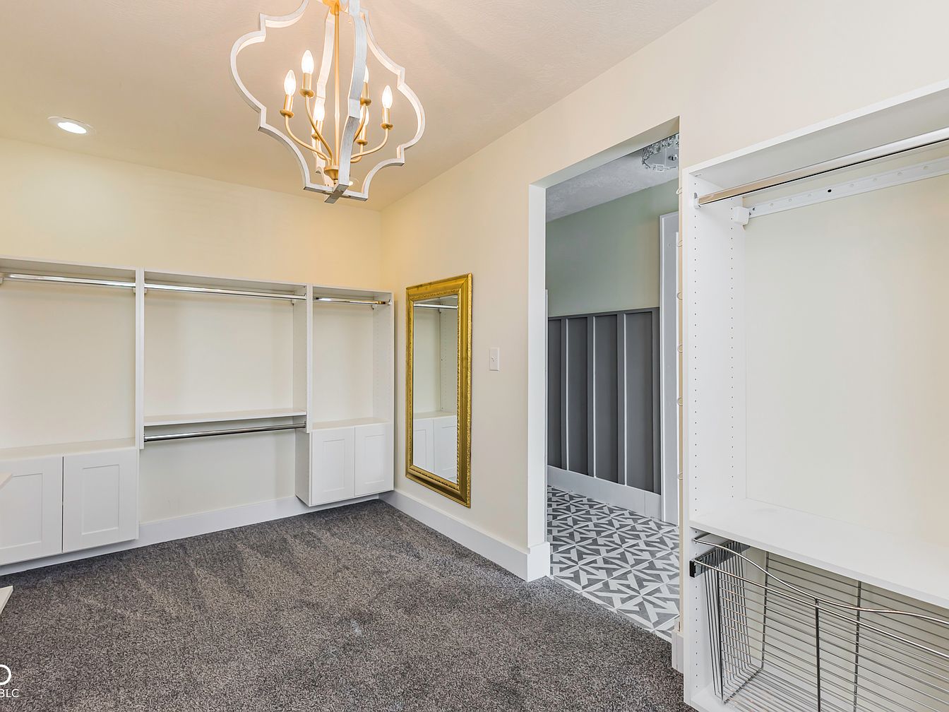A spacious, well-lit walk-in closet features open shelving and multiple hanging rods in a crisp white color. The carpeting is a plush gray, providing a soft contrast to the white shelving and cabinets. A large, gold-framed mirror leans against one wall, enhancing the sense of space and light. The ceiling light fixture is modern and elegant, with a geometric frame and candle-style bulbs that add a touch of sophistication. Through the wide doorway, a hallway with bold geometric-patterned floor tiles and dark wainscoting is visible, bringing a contemporary element to the adjacent space.
