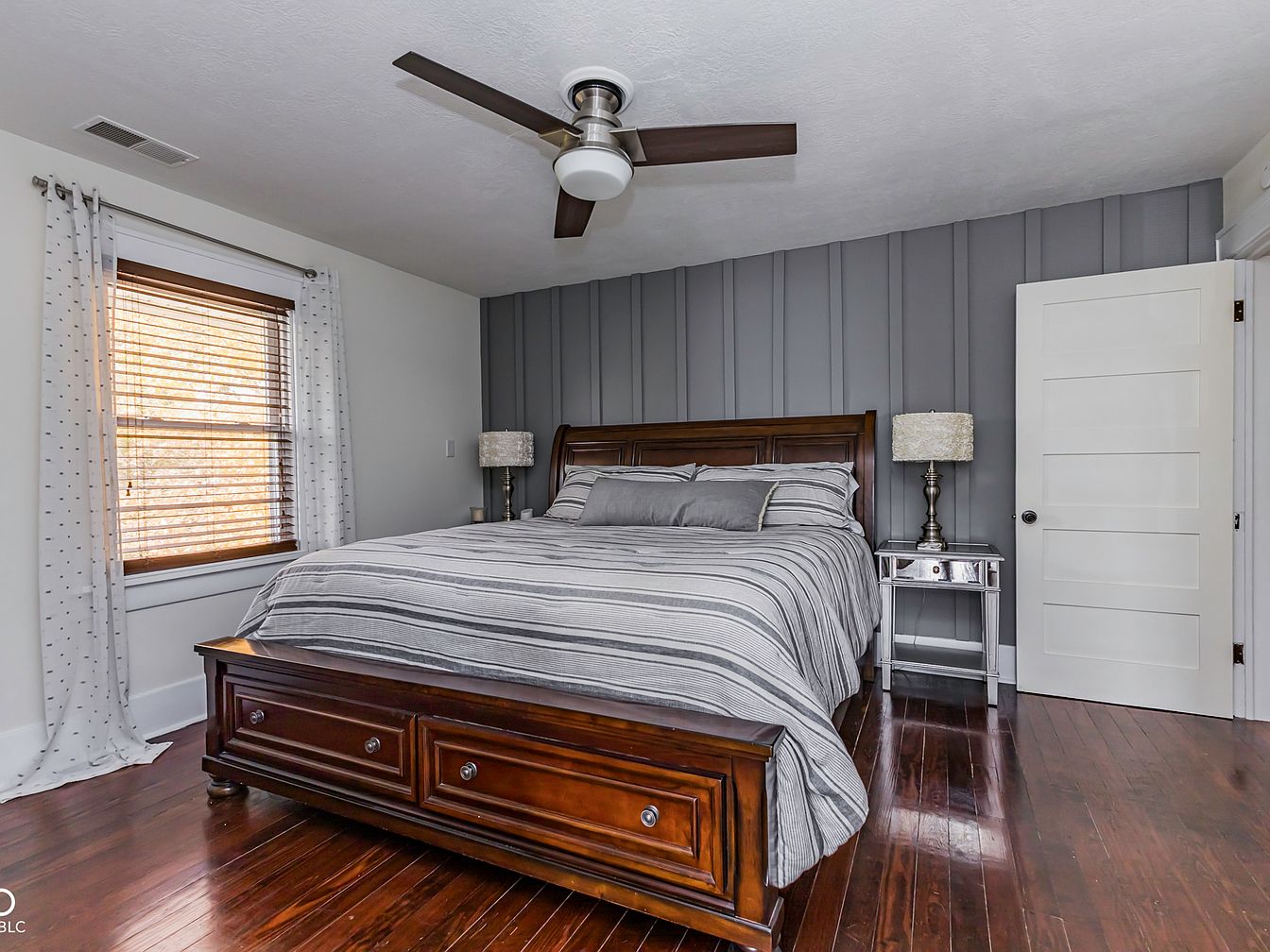 This bedroom features a rich, dark wood floor with a glossy finish and a substantial, classic wooden bed frame dressed in striped gray and white bedding. The far wall is paneled in vertical gray boards that add texture and depth, contrasted by smooth, white side walls. Mirrored nightstands flank the bed, each topped with a textured lamp, lending a touch of modern glamour. Light enters through a window dressed in sheer, dotted curtains and wooden blinds, softening the look. A sleek ceiling fan with dark wooden blades and brushed metal adds to the clean-lined, contemporary yet cozy atmosphere.